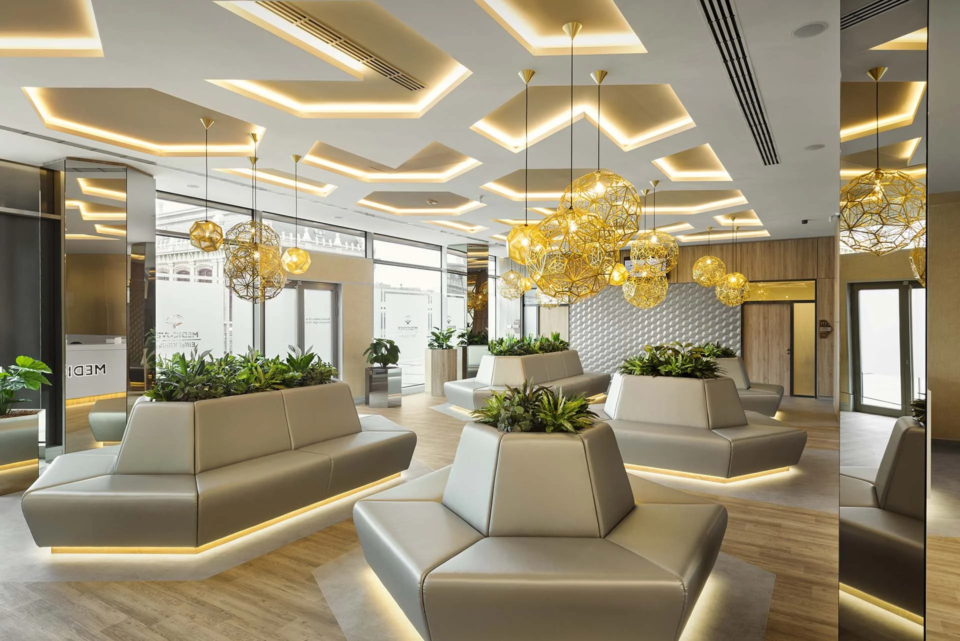 - Hungarian private clinic’s Eiffel Square center have its defining design elements reminiscent of their Budapest hospital’s interiors: airy spaces, delicate colors, hexagonal shapes and the lamps of Britain’s great designer, Tom Dixon. Warm lights of hidden and oblique lighting help the patiens to spend their waiting time in a cozy atmosphere within the ultramodern healthcare milieu.